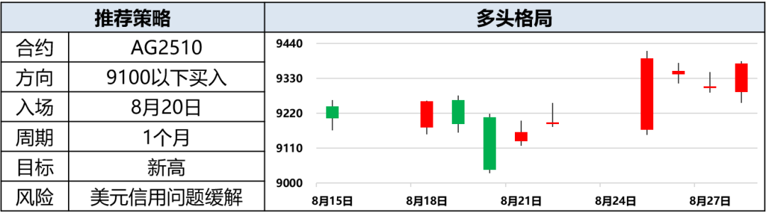白银:美国经济边际降温但暂无显著“衰退”风险。美联储降息也已成为高概率事件,货币、财政政策宽松的大方向基本明确。白银多头格局清晰。本周白银10合约虚值卖看跌期权已止盈,建议继续持有白银10合约多单。