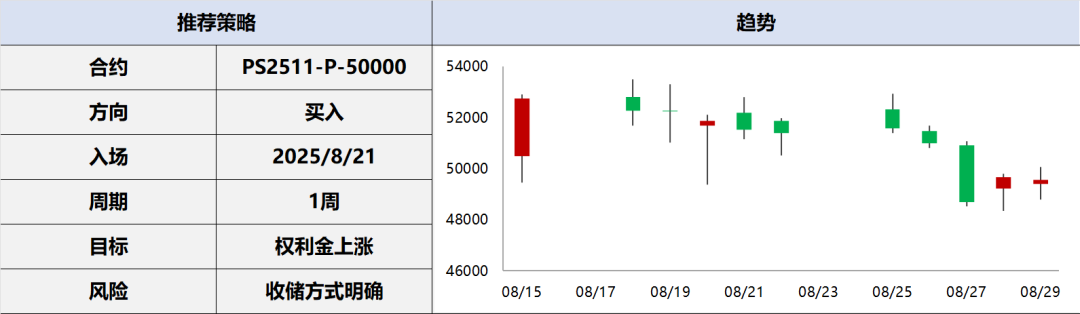 碳酸锂周度产量维持在1.9万吨之上,辉石提锂产线增产积极,库存虽不断向下游转移,但总库存去化偏慢,短期供给维持宽松局面,锂价走势仍将承压,但9月30日宜春矿企需递交储量核实报告,锂资源端事件扰动预期仍存,前空谨慎持有。8月多晶硅产量大幅增加,目前云南地区某基地已达满产状态;新疆、青海地区存在新增投产及复产增量的情况,整体呈现供大于求的市场格局。多晶硅企业库存下降,库存向下游转移,但行业整体库存累积。目前产能出清具体路径并不明确,预计短期内多晶硅市场将保持弱势运行。